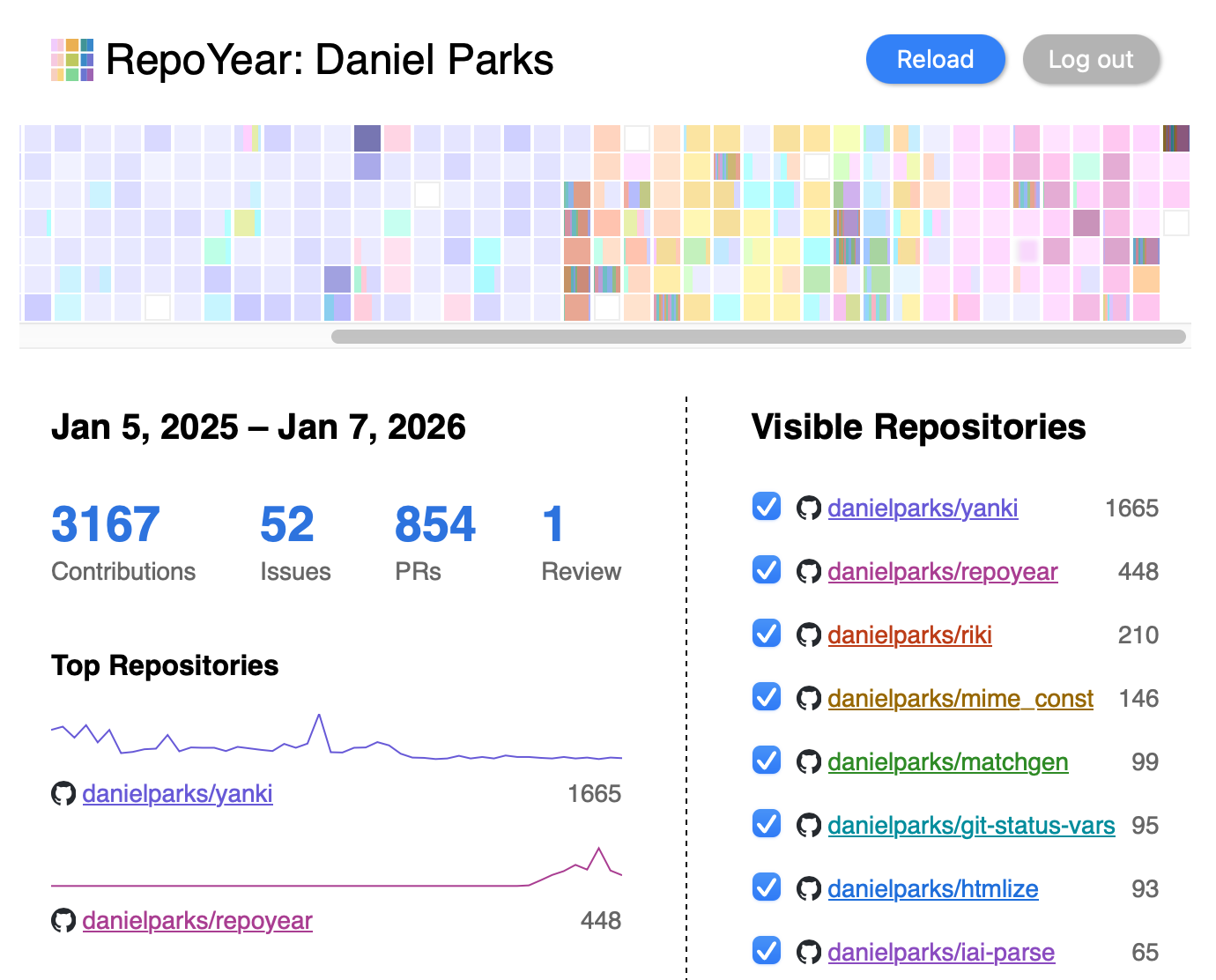 This started as a way to familiarize myself with React, TypeScript, and GraphQL. It loads the last year of a user’s GitHub contributions from GitHub’s GraphQL endpoint and displays them as a color-coded graph (demo).